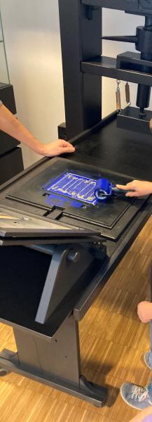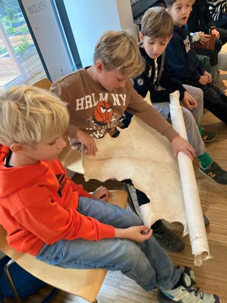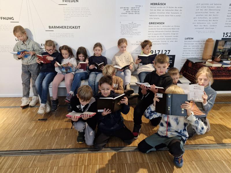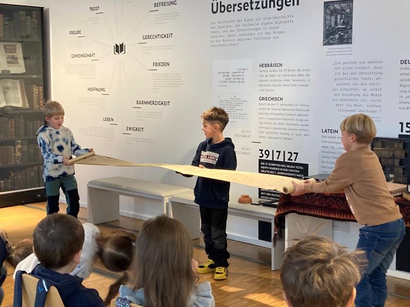 Dabei lernten sie, dass Bibeltexte auf Stein, Wachs, Papyrus, Pergament oder Papier geschrieben wurden und durften selbst einen Psalm-Text mit der Druckerpresse drucken und mit nach Hause nehmen.