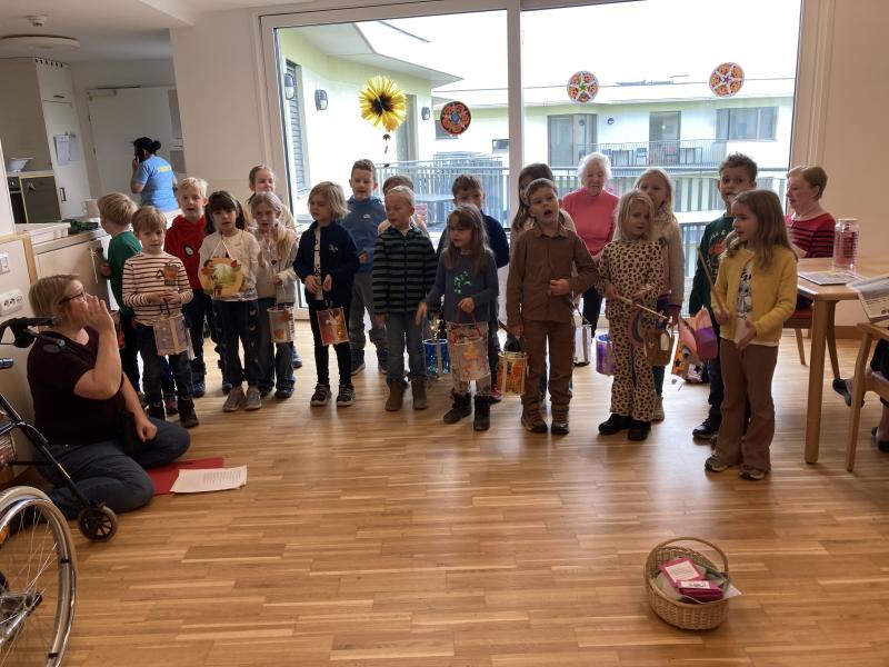 bis ins Altenheim der Barmherzigen Brüder. Das taten die Kinder der 1a und 1b. Sie marschierten mit ihren Laternen durch das Altenheim und bereiteten den Bewohnerinnen und Bewohnern Freude durch das Singen von Martinsliedern und durch ihre Gedichte. Die Kinder hatten im Vorfeld fleißig Martinsbilder gemalt, die sie dann zum Abschied ihrem begeisterten Publikum austeilten.