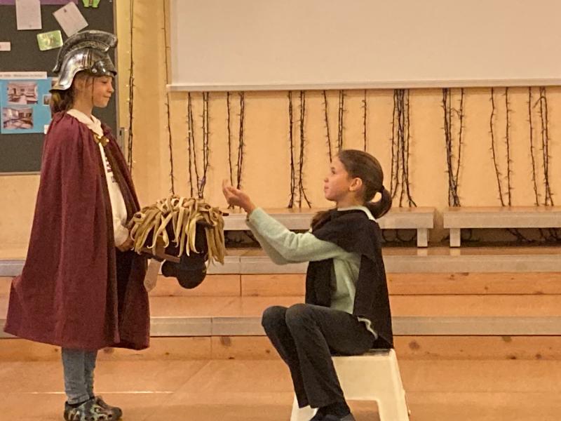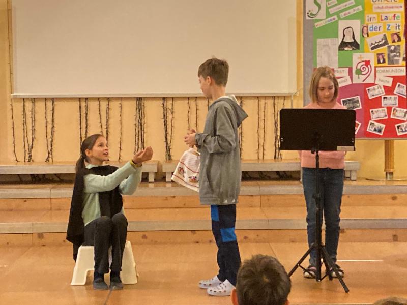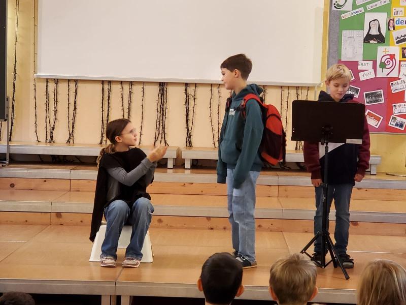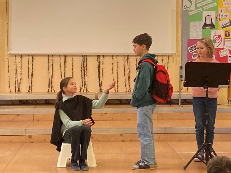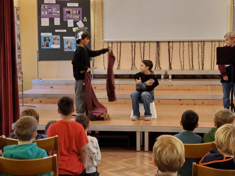 Die beiden anderen Gruppen hatten ihren großen Auftritt dann am Martinstag in der Schule. Sie durften den anderen Klassen und der Schulstartgruppe das Martinspiel vorführen. Die Proben haben sich gelohnt! Es waren 3 großartige, sehr gut gespielte, Darbietungen.
